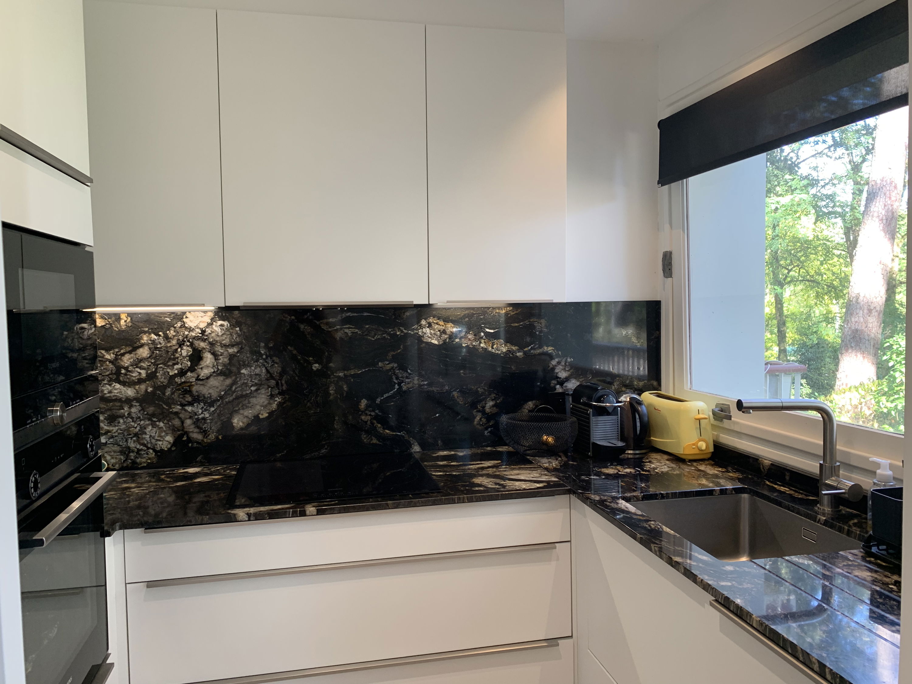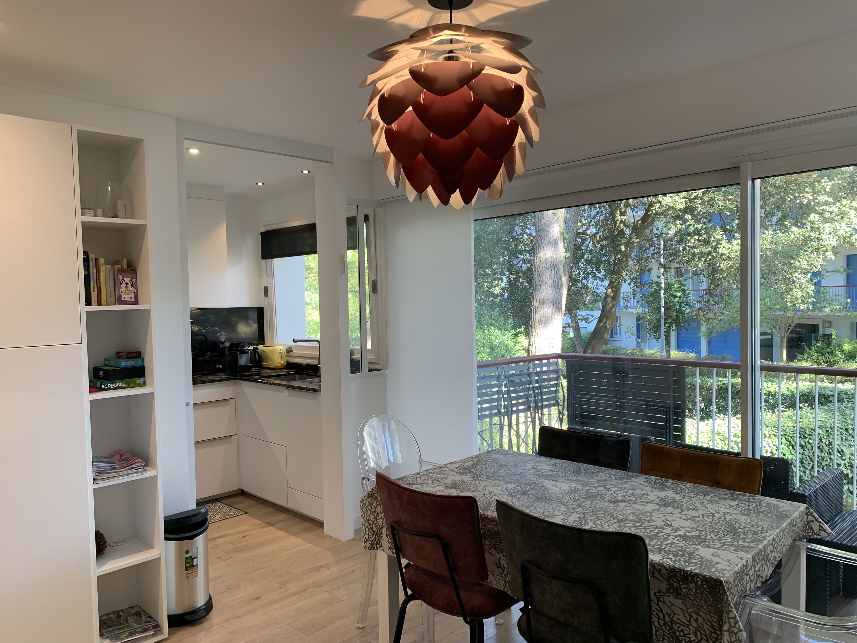 - Cuisine aménagée et équipée (réfrigérateur/congélateur - Micro-ondes - Plaques induction - Hotte - Cafetière Nespresso - Bouilloire - Lave-vaisselle) ouverte sur la pièce de vie avec canapé-lit de 140x190 (TV)
