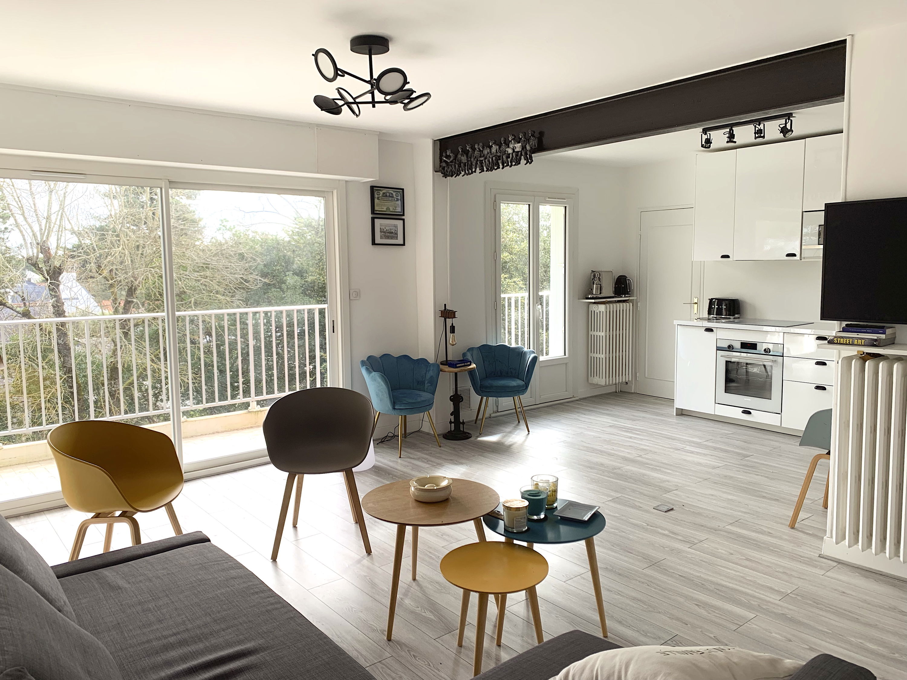 - Cuisine équipée et ouverte sur la pièce de vie (plaque vitrocéramique, lave vaisselle, micro-ondes, four, bouilloire, machine Nespresso "Creatista plus")