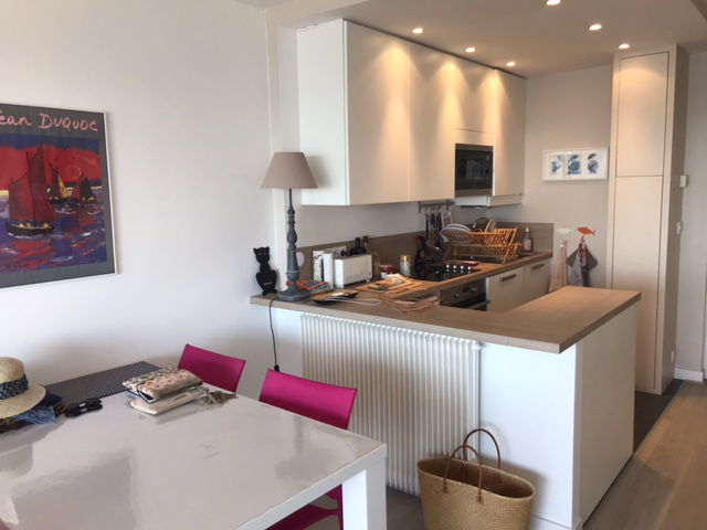 Appartement au 3ème étage d'une Résidence de standing comprenant : Entrée / dégagement – Salon/Séjour avec TV ouvrant sur terrasse face mer (salon de jardin) – Cuisine américaine aménagée / équipée (4 plaques vitrocéramique – four – Lave-vaisselle - Réfrigérateur - micro-ondes) - WC – Salle de bain avec lave-linge – Chambre sur arrière 1 lit en 160/190 – Parking privé en sous-sol pour petite voiture. WIFI FIBRE - N°MAIRIE : 4405500085361