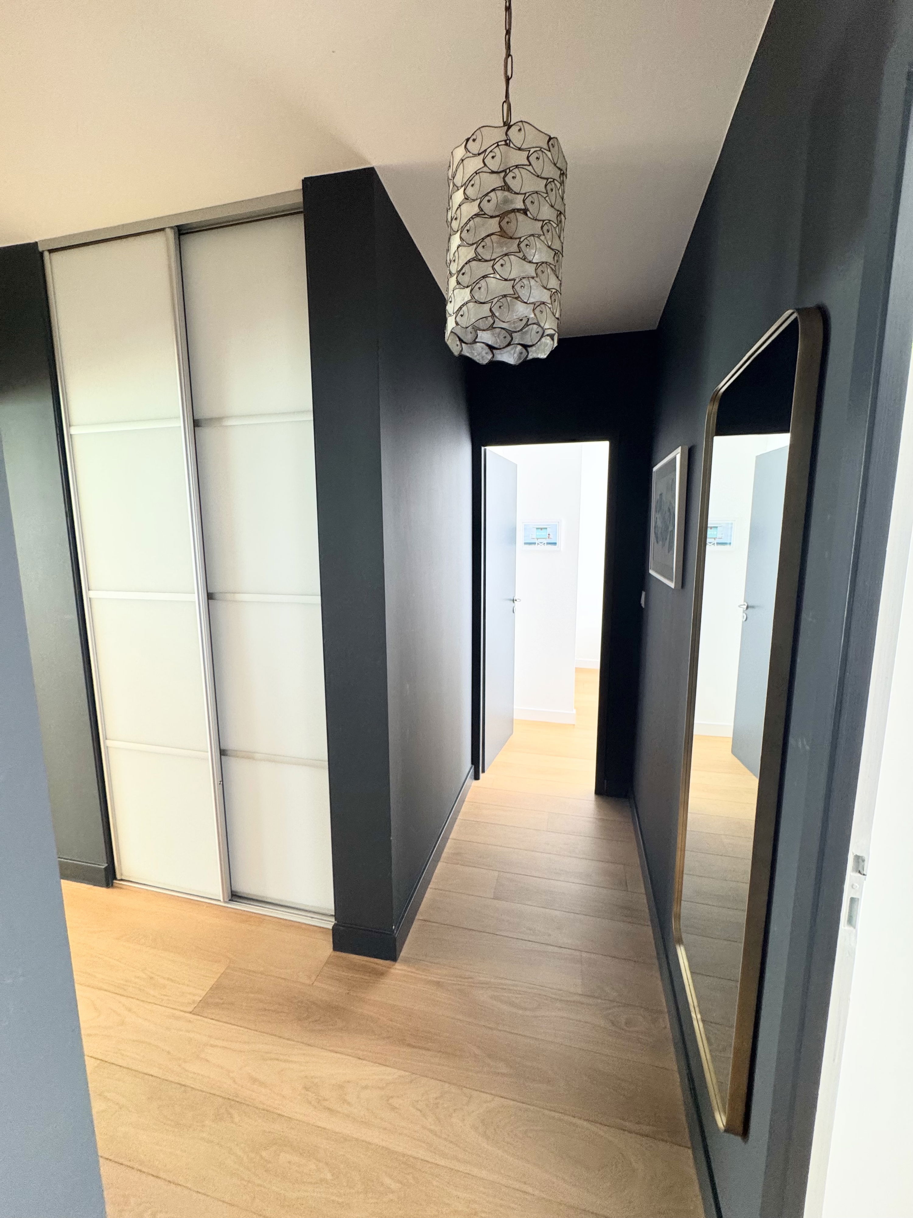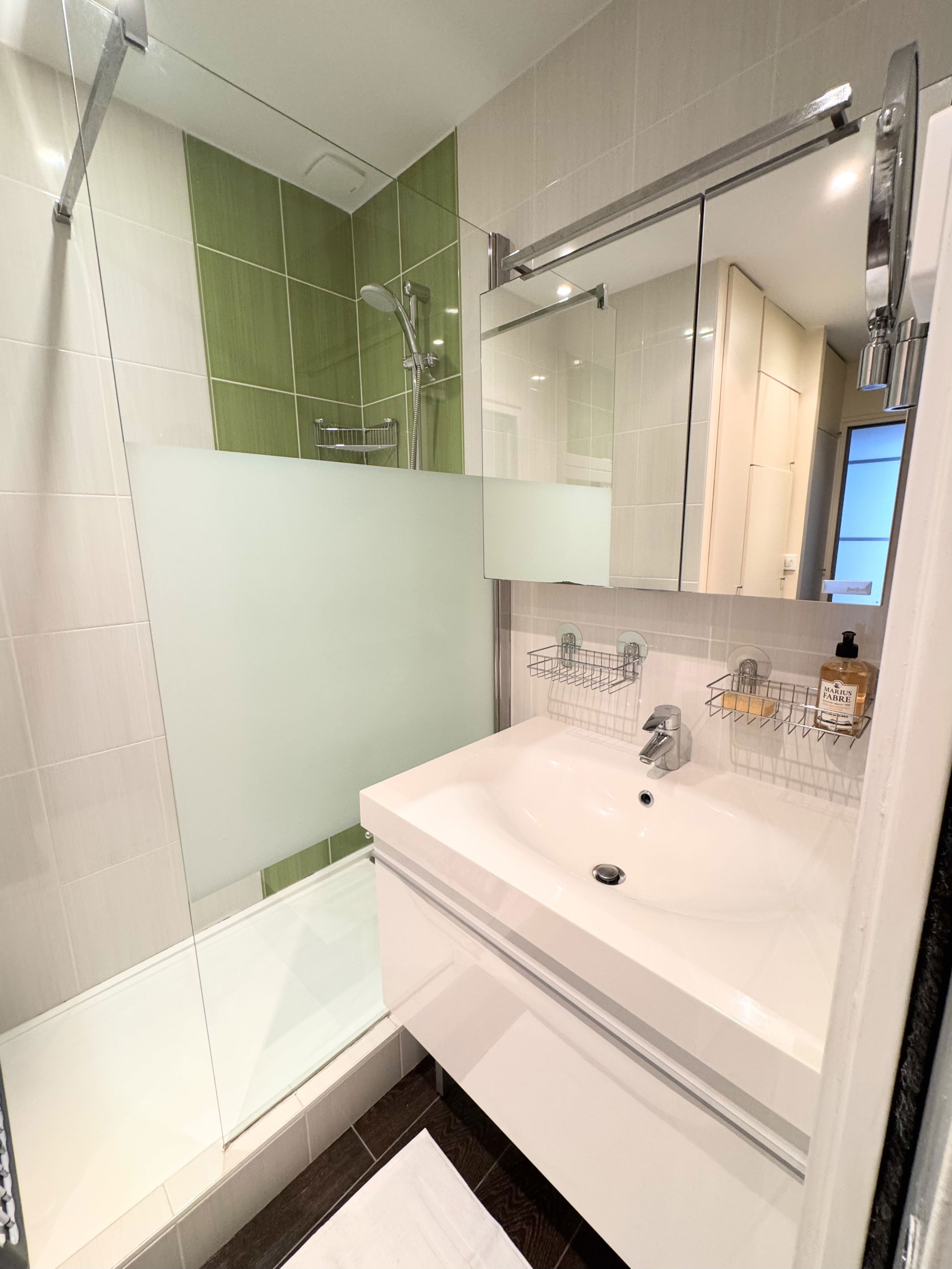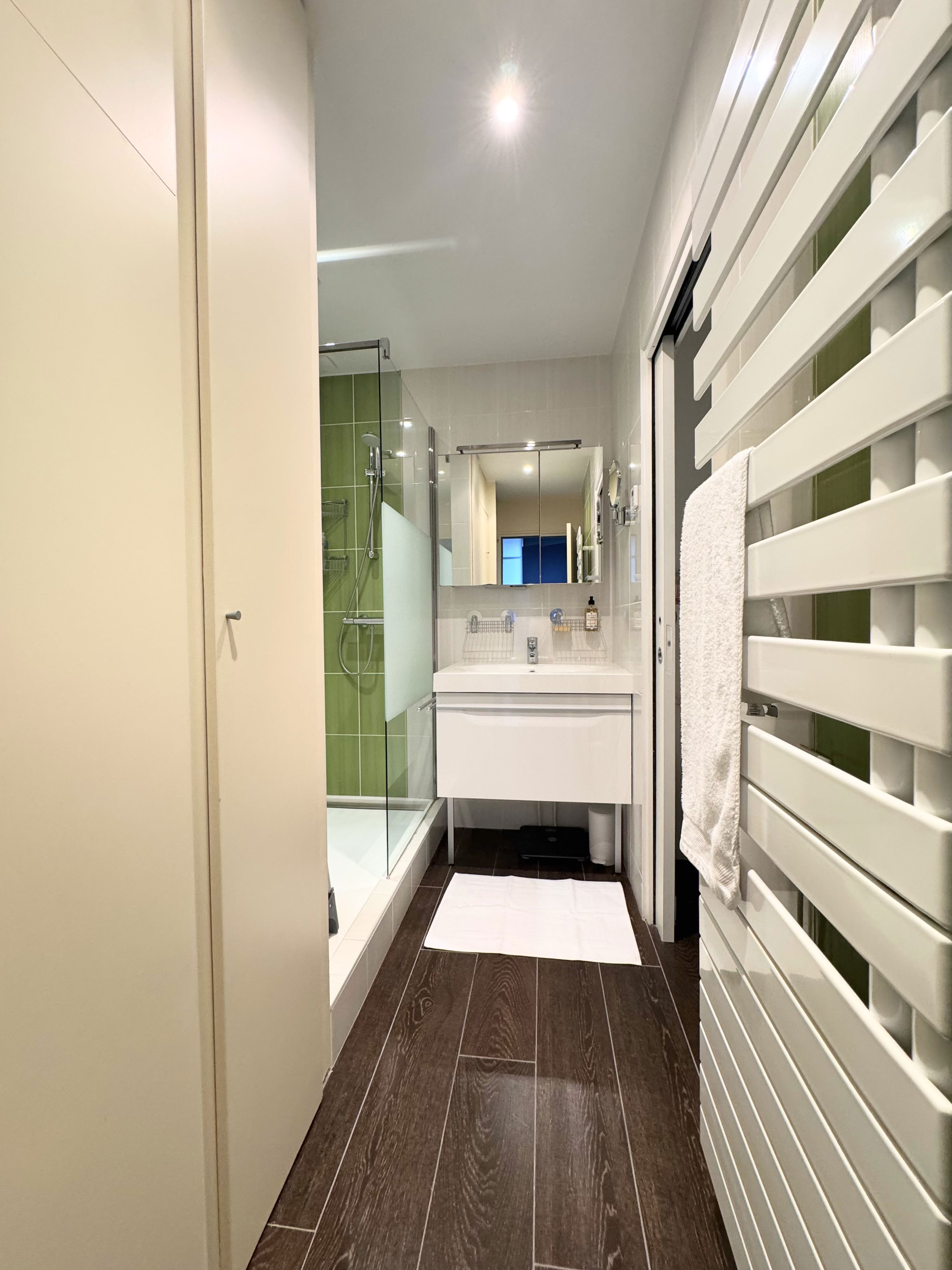 1 salle d’eau moderne dont une avec WC suspendu + lave-linge / sèche-linge