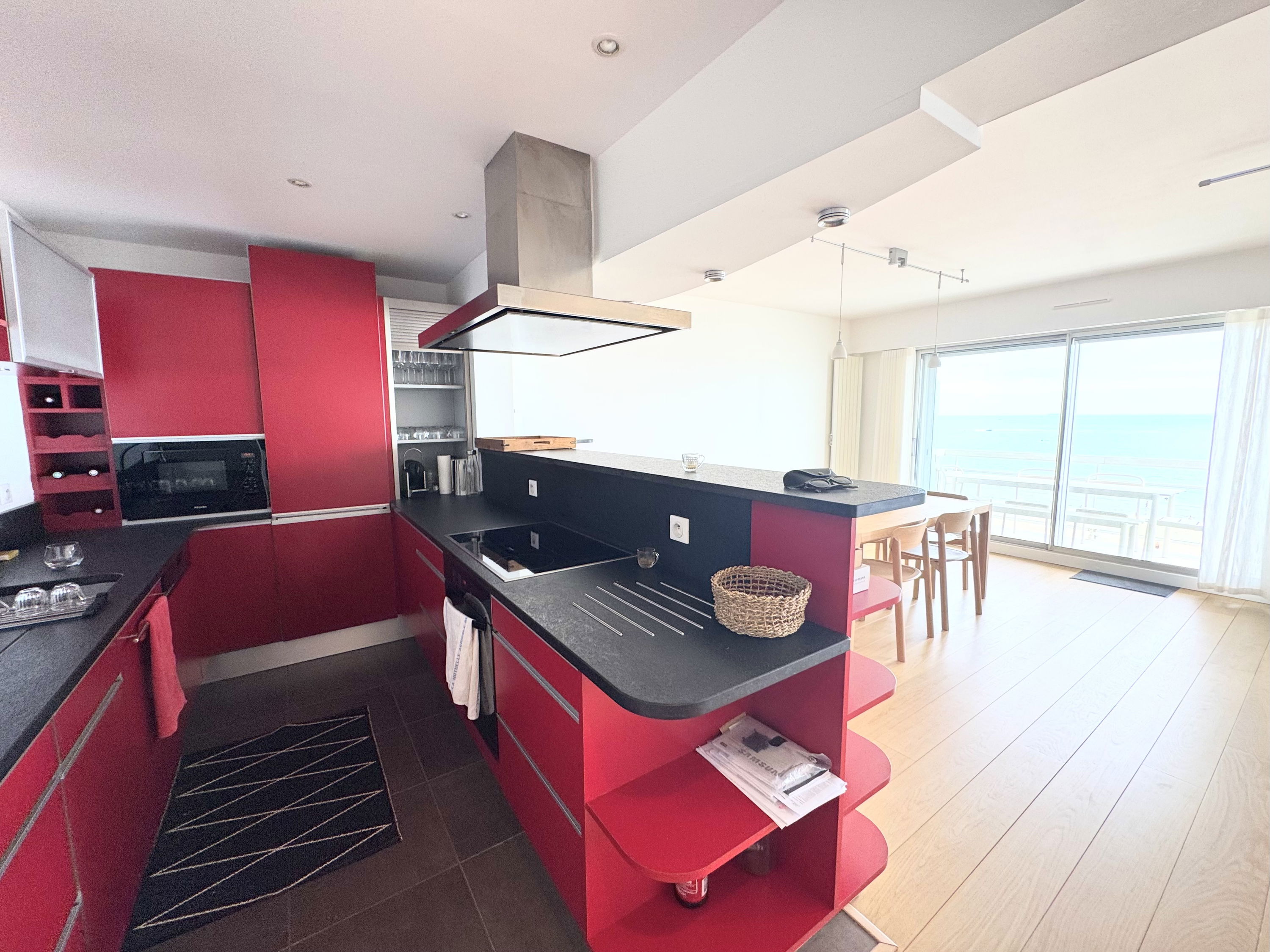 Une entrée - Une cuisine américaine moderne et fonctionnelle : bar avec plaques induction (4 feux), four électrique, micro-ondes, lave-vaisselle, réfrigérateur-congélateur, bouilloire, Nespresso, vaisselle complète