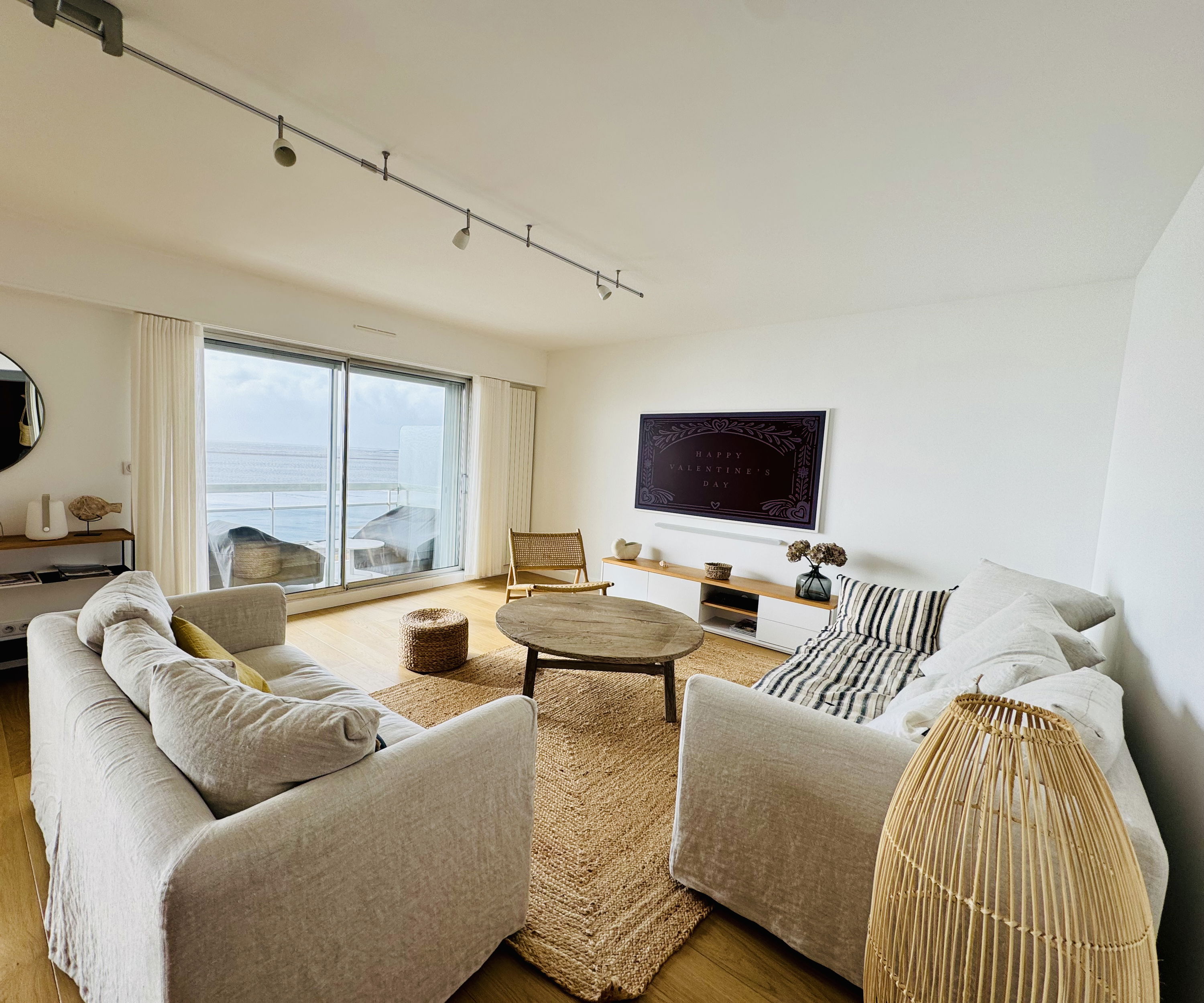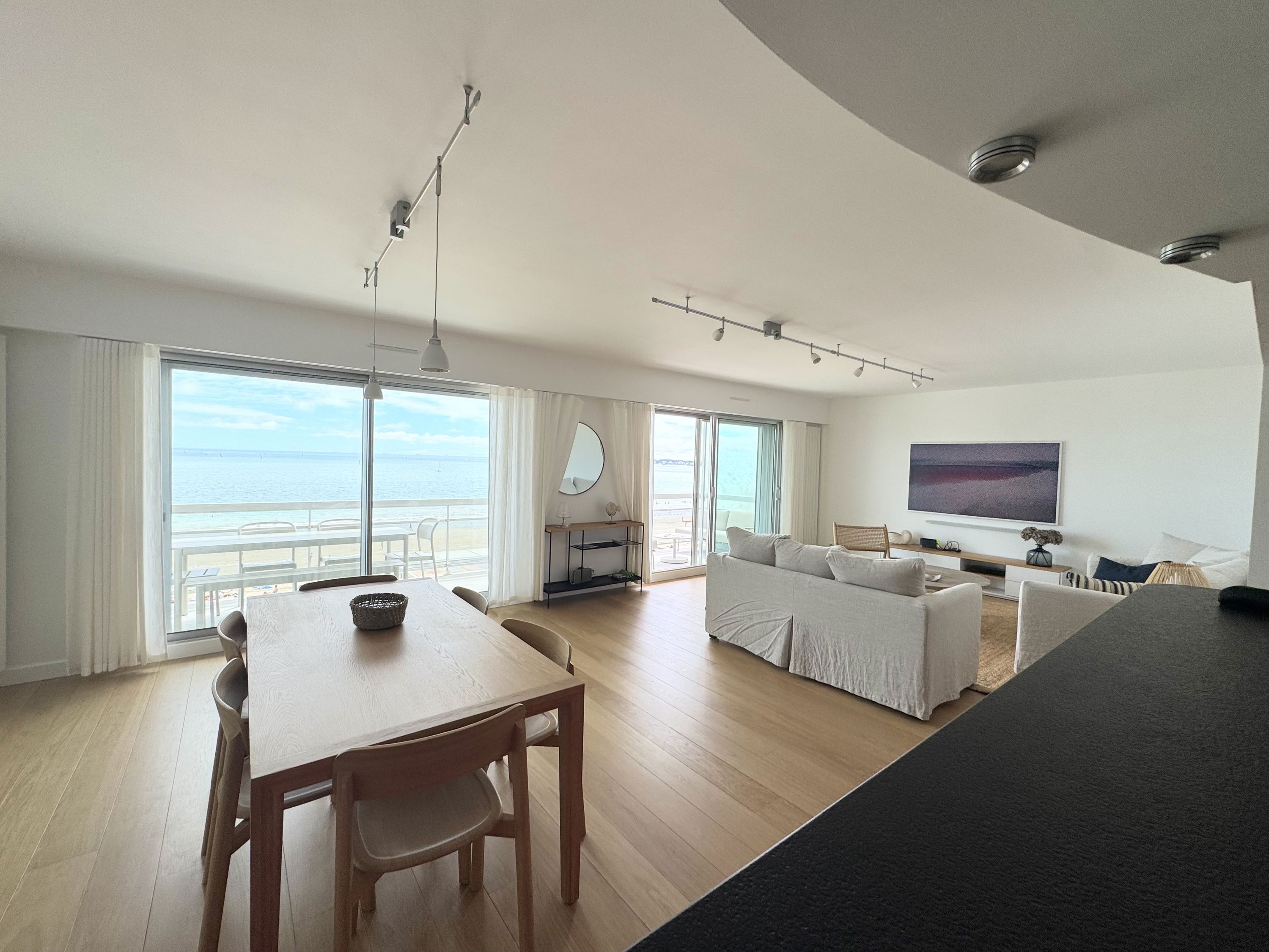 Un vaste salon-séjour face mer, parqueté en chêne massif, avec double baie vitrée, volets roulants électriques avec commande centralisée, grande TV murale, deux canapés, grande table bois (90x200 cm) et 6 chaises