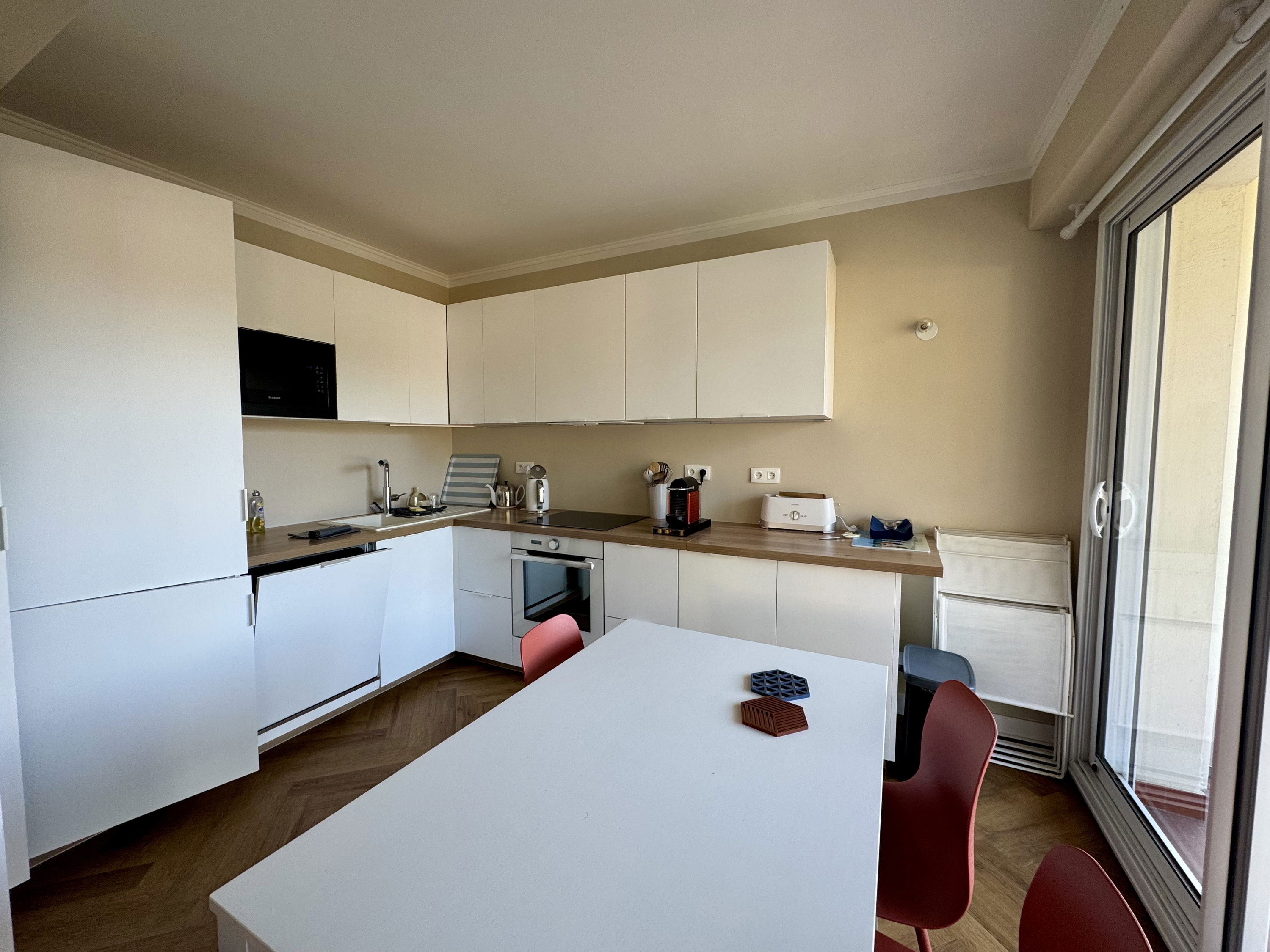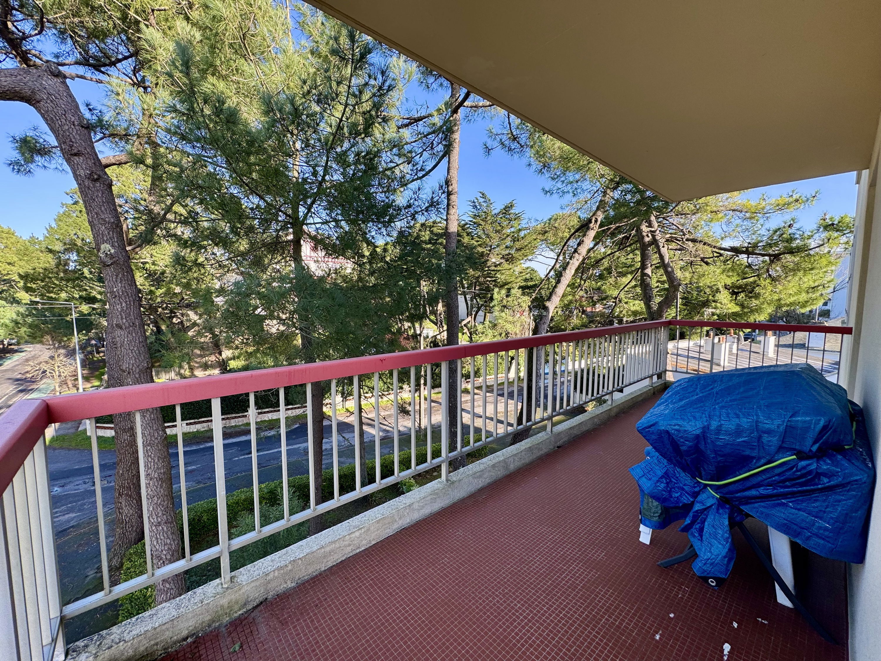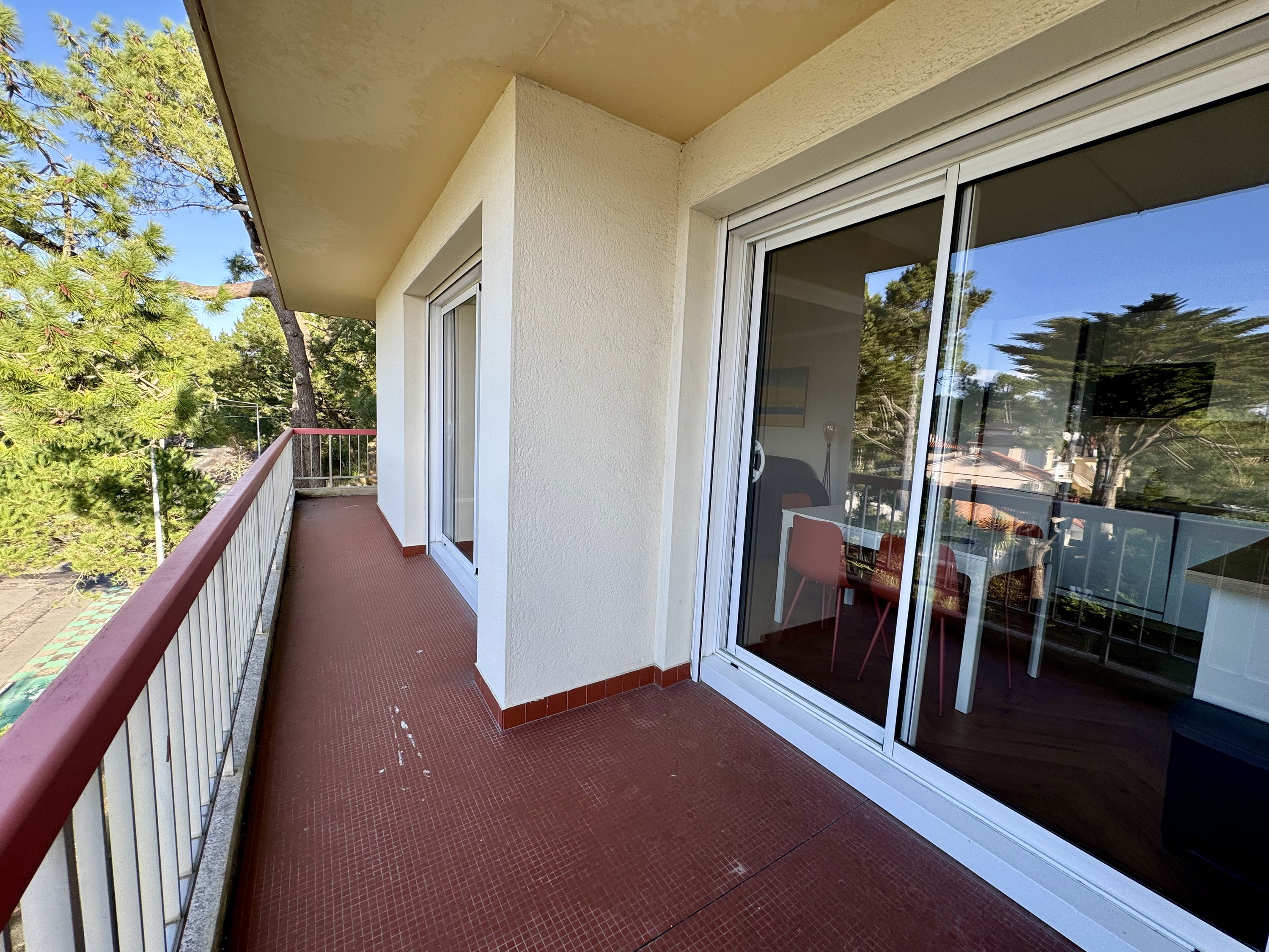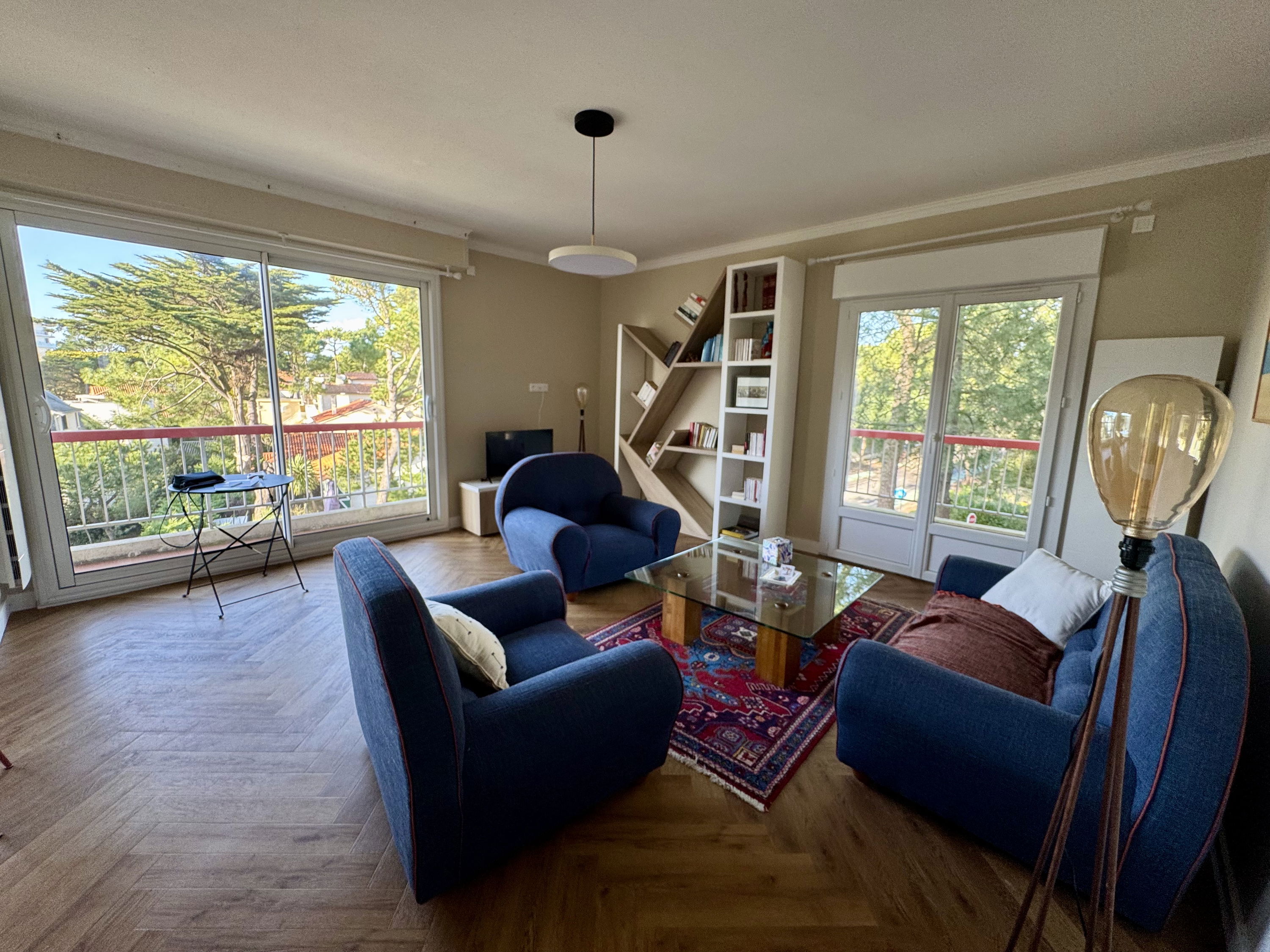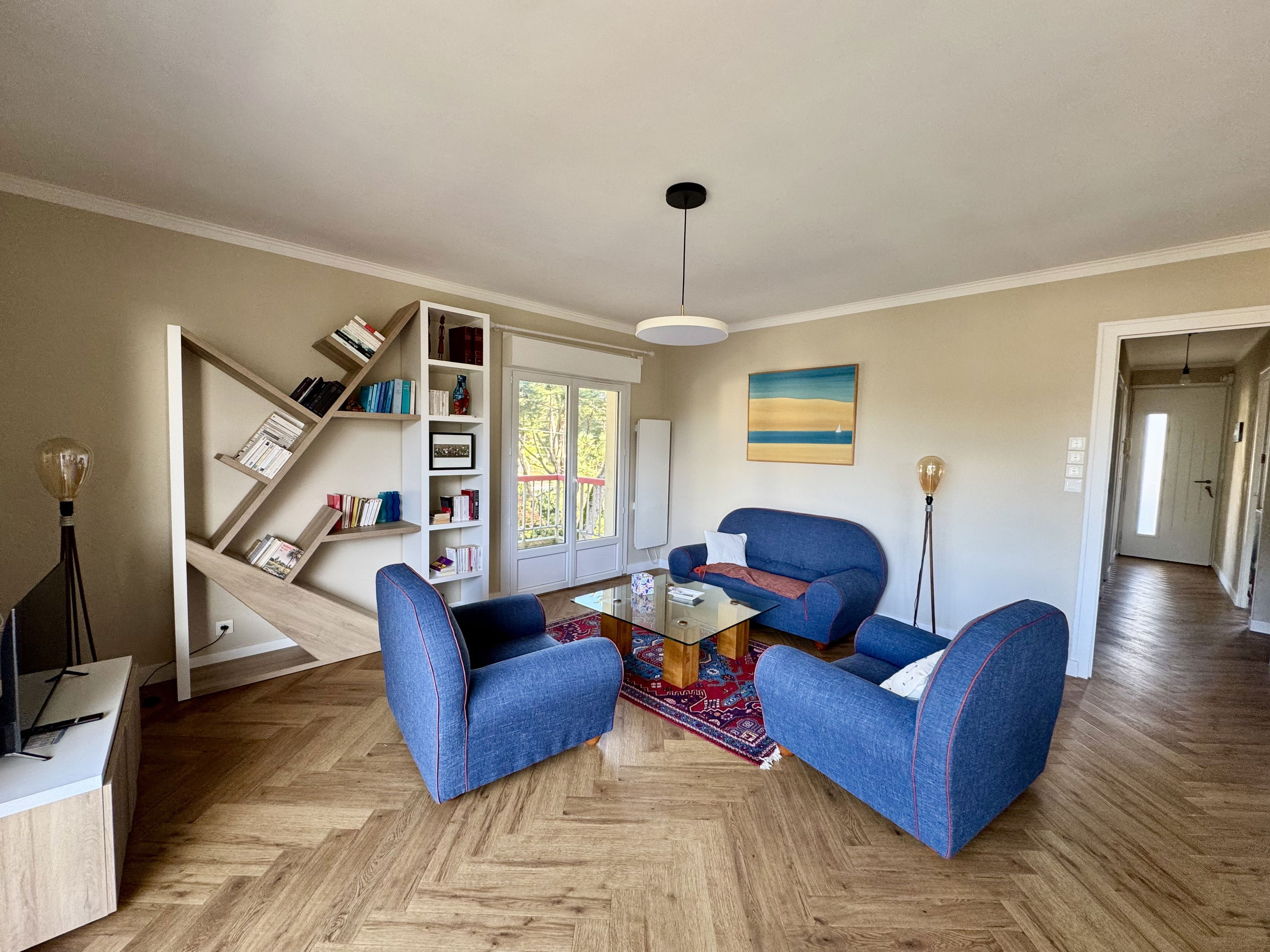 Le séjour s’ouvre sur une grande terrasse d’angle à double exposition, véritable atout du logement, aménagée avec mobilier extérieur et deux bains de soleil. Un espace idéal pour les repas, la détente ou simplement profiter du climat de La Baule.
