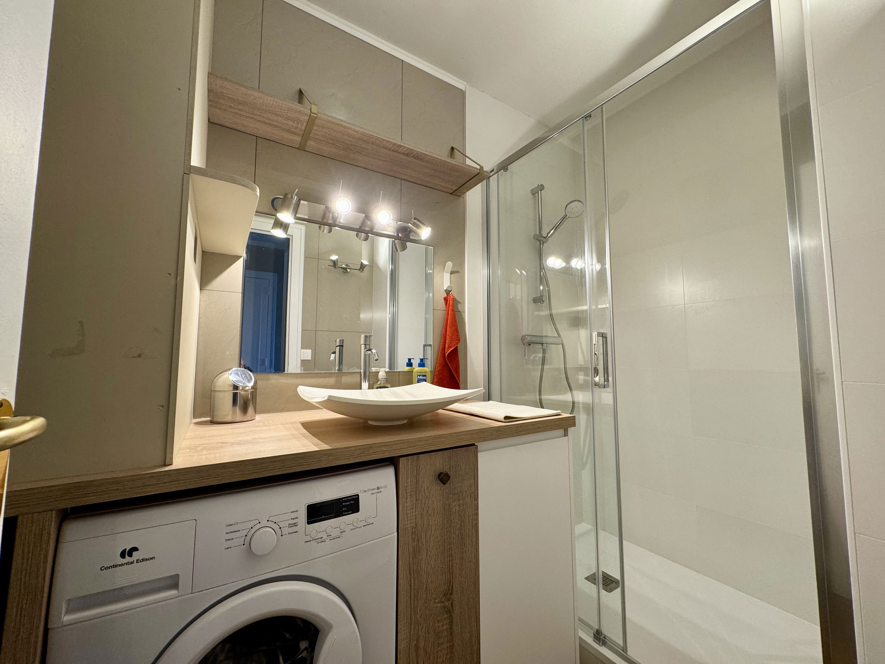 Une salle d’eau avec douche, meuble vasque et lave-linge, ainsi qu’un WC indépendant, complètent cet espace.