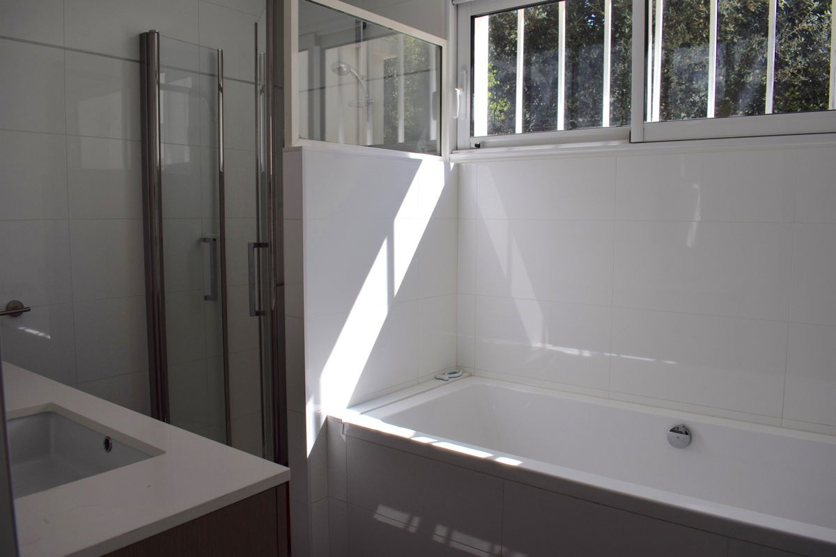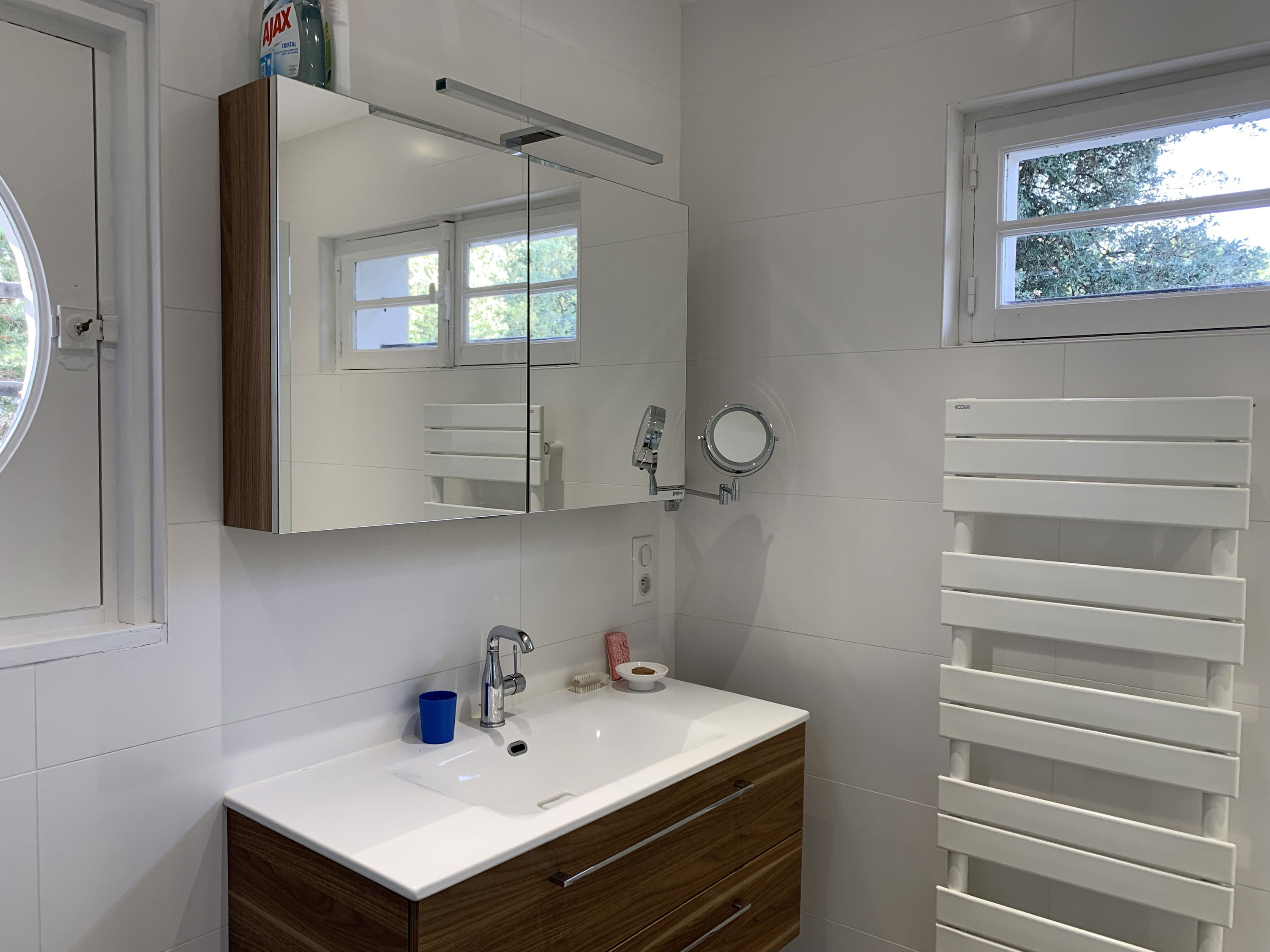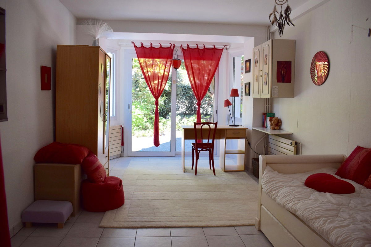 Rez-de-jardin : Chambre n°3 avec 2 lits gigognes 80/190 ouverte sur jardin - Douche italienne - Chambre n°4 avec lit 140/190 + placard - Chambre n°5 avec 2 lits gigognes 80/190 + lit simple de 80/190 + placard - Lingerie avec Lave-linge et Sèche-linge - WC ind. - SDB avec douche et baignoire.