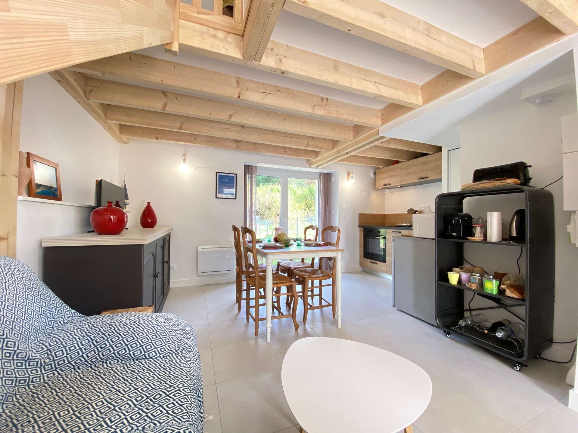 Maison 2 pièces - 38 m² environ - jusqu'à 4 personnes avec jardin et place de stationnement dans résidence sécurisée. Dans une résidence récente sécurisée, cette maison se compose d'un séjour, salon avec cuisine ouverte aménagée équipée donnant sur le jardin privatif, d'une salle de douche avec wc. A l'étage: un palier et une grande chambre. Parking privé.