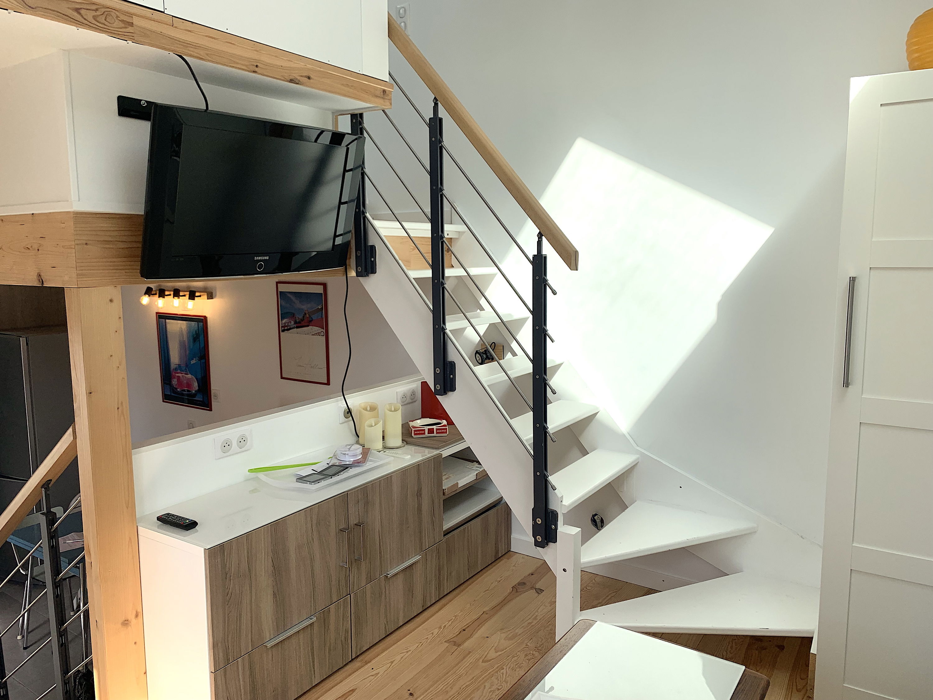 Elle bénéficie : Salle à manger - Cuisine ouverte et aménagée (bouilloire, Nespresso, plaque induction, hotte, lave-vaisselle, machine à laver, sèche-linge, four, micro-ondes, cafetière filtre, grille pain)- Chambre en Rez-de-jardin (lit 160/190 + rangements) - Salle d'eau (douche, WC et sèche-serviette)
