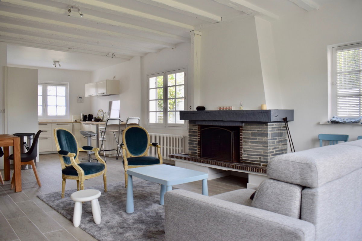 Au Rez de chaussée : Entrée - Pièce de vie avec Cuisine ouverte Aménagée et Équipée (Plaques - Hotte - Four - Micro Ondes - Lave Vaisselle - Nespresso - Bouilloire et Grille Pain) proposant TV écran plat et cheminée à foyer ouvert donnant sur terrasse et jardin - Wc indépendant avec lave main - Garage et buanderie avec lave linge + sèche linge et douche de retour de plage.